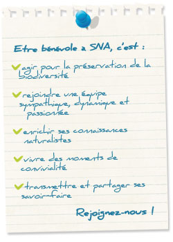 Vous aimez la nature ? Vous voulez la protéger ? Devenez un acteur de sa protection, en consacrant un peu de votre temps libre ou en mettant vos idées, vos compétences au service de la faune sauvage… Quels que soient vos talents, il y a une place pour vous dans notre association. Seules l'envie et la motivation comptent pour participer à l'ensemble des projets de SNA. Si vous souhaitez rejoindre notre équipe de bénévoles, contactez-nous !