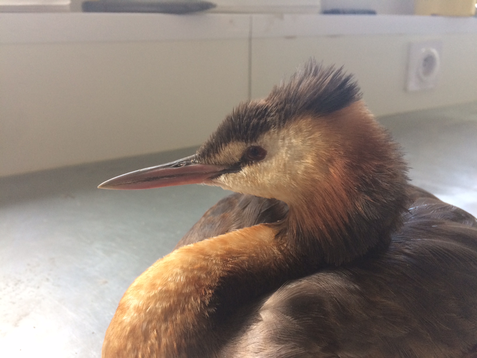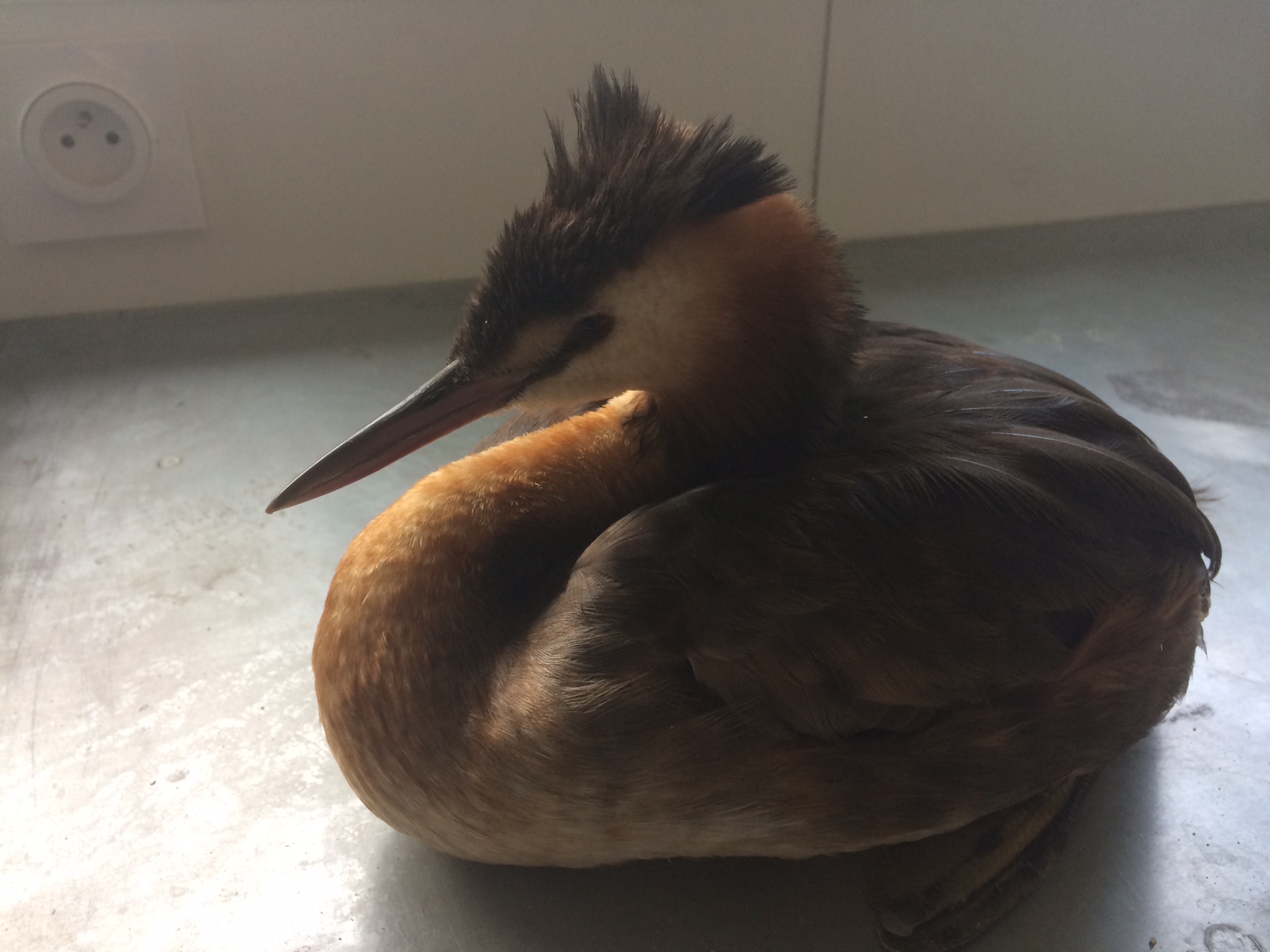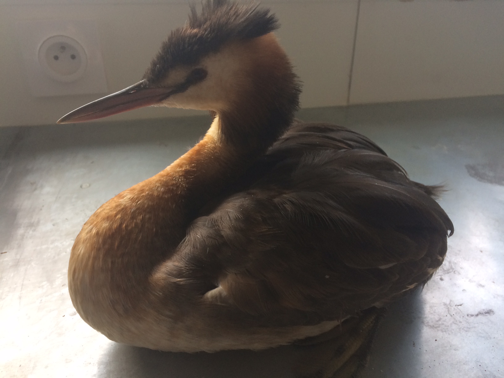 Le Grèbe que nous avons recueilli était essentiellement affaiblit, pas de blessure apparente. Aujourd’hui nous le gardons dans un espace spacieux, avec un grand bassin pour qu’il puisse pêcher ses poissons, reprendre du poids et enfin il pourra être relâcher sur son lieu de découverte.